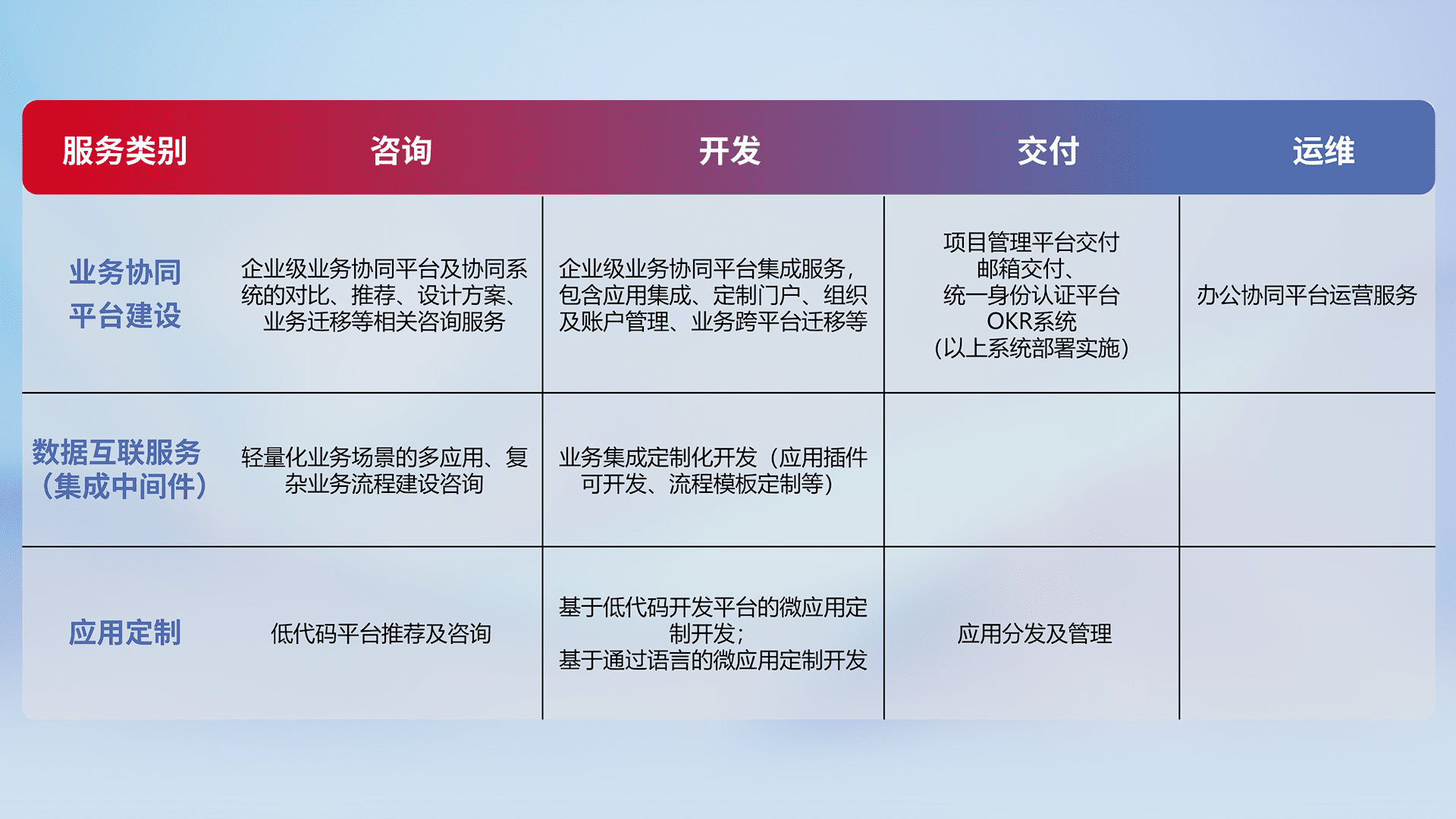 针对钉钉、、、、企微、、IDaas等平台级产品提供产品的规划、、、、方案、、、交付、、、定制化开发等服务,,,实现如统一协同办公、、智能客户服务、、、混合会议管理、、、、智能数据查询、、、、等业务场景,,,,实现数字化转型。。